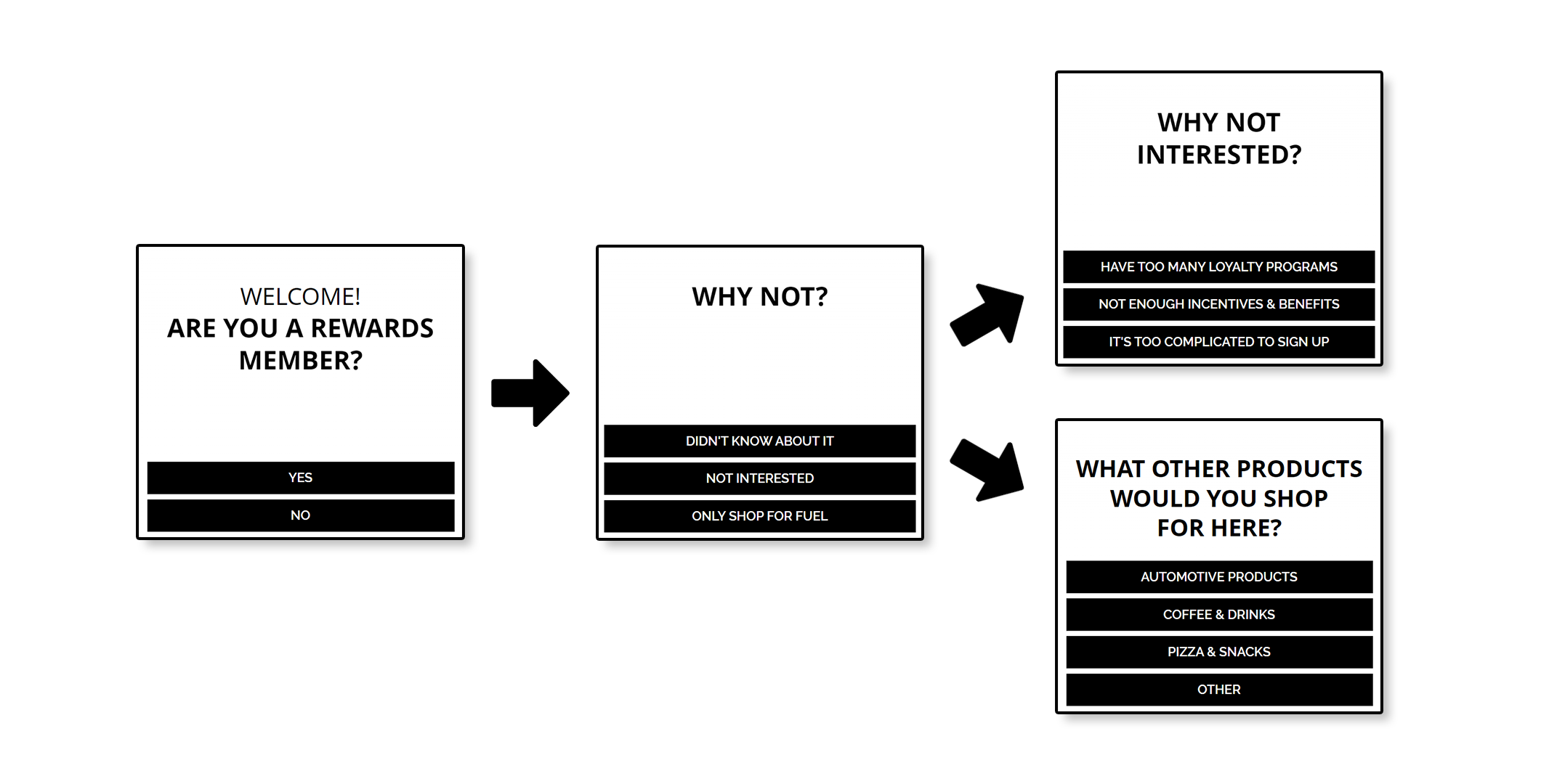 We have found that for our customers, one of the most effective ways to uncover why program enrollment is low is to simply ask your customers why they aren't signing up- this is simple yet highly effective. Below we use an anonymized but real example of one of our clients, a large regional gas station and convenience store, using simple, multistep survey cards to uncover valuable data about their loyalty program enrollment.